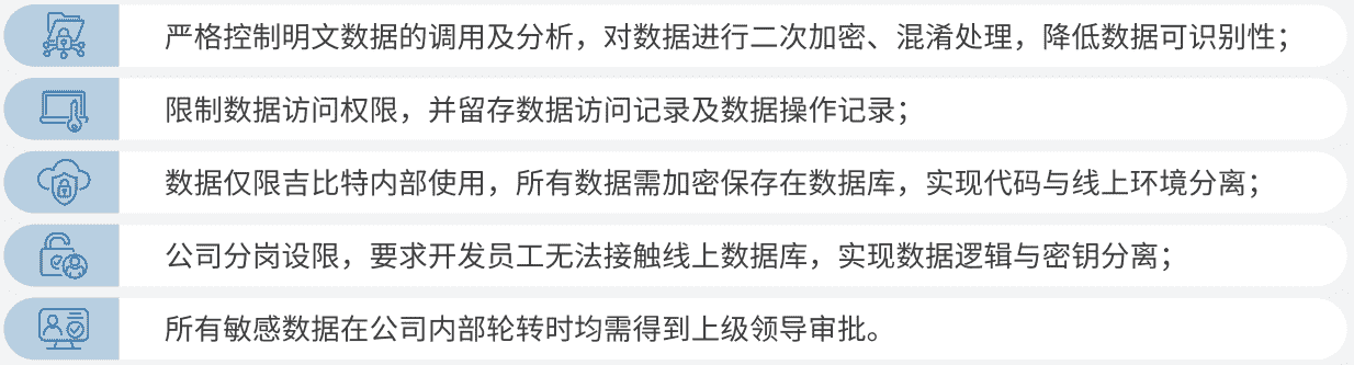 公司對(duì)用戶個(gè)人信息實(shí)施脫敏處理,,,,嚴(yán)格限制用戶信息用途,,數(shù)據(jù)使用完成后集中歸檔處理。。。為進(jìn)一步確保數(shù)據(jù)處理過程的安全,,,,公司根據(jù)實(shí)際的業(yè)務(wù)工作分崗設(shè)限,,最大程度保護(hù)數(shù)據(jù)隱私安全,,如在生產(chǎn)網(wǎng)絡(luò)中的加密數(shù)據(jù)由研發(fā)部門員工負(fù)責(zé)編寫加、、解密程序,,,,但其無法直接訪問到加密后的數(shù)據(jù)庫;程序的加、、、、解密密鑰由運(yùn)維員工單獨(dú)配置。。。。