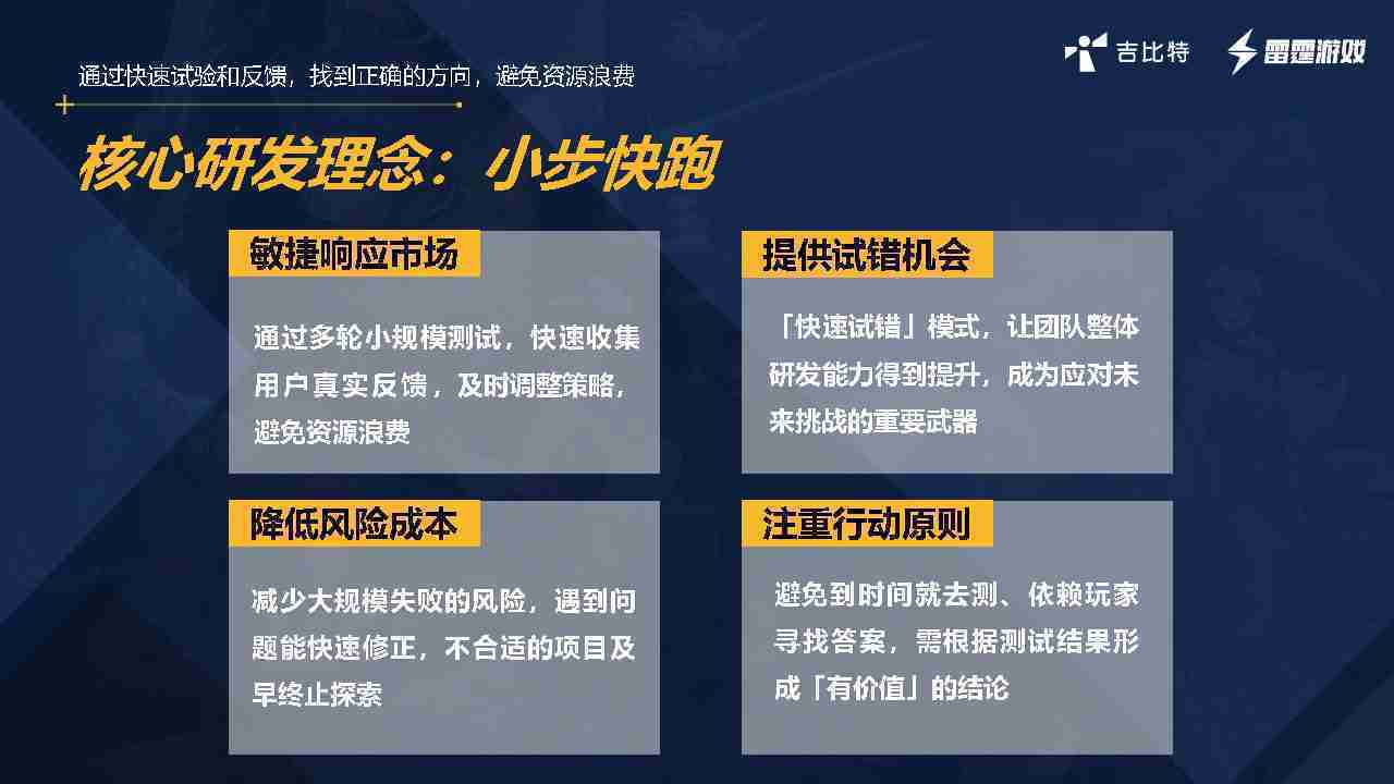 所以為了考慮把一個玩法怎么做得好玩,,游戲做得好玩,,,,我們一直在探索小步快跑的研發模式。。小步快跑是目前35273體系內,,,在研發過程中對于不確定性應對的工具,,,也是我們關鍵性的心法。。。