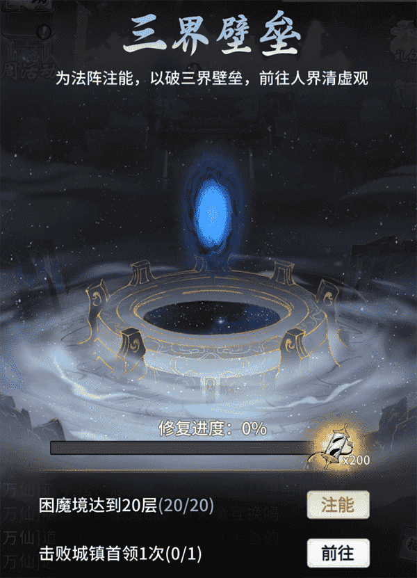 當你修為達到返虛/破虛中期后,,,可在城鎮尋得蕓丫并激活神秘法陣,,通過收集材料、、、擊敗首領等方式為法陣注能,,,,借以打破三界壁壘,,開啟支線劇情“清虛舊夢”